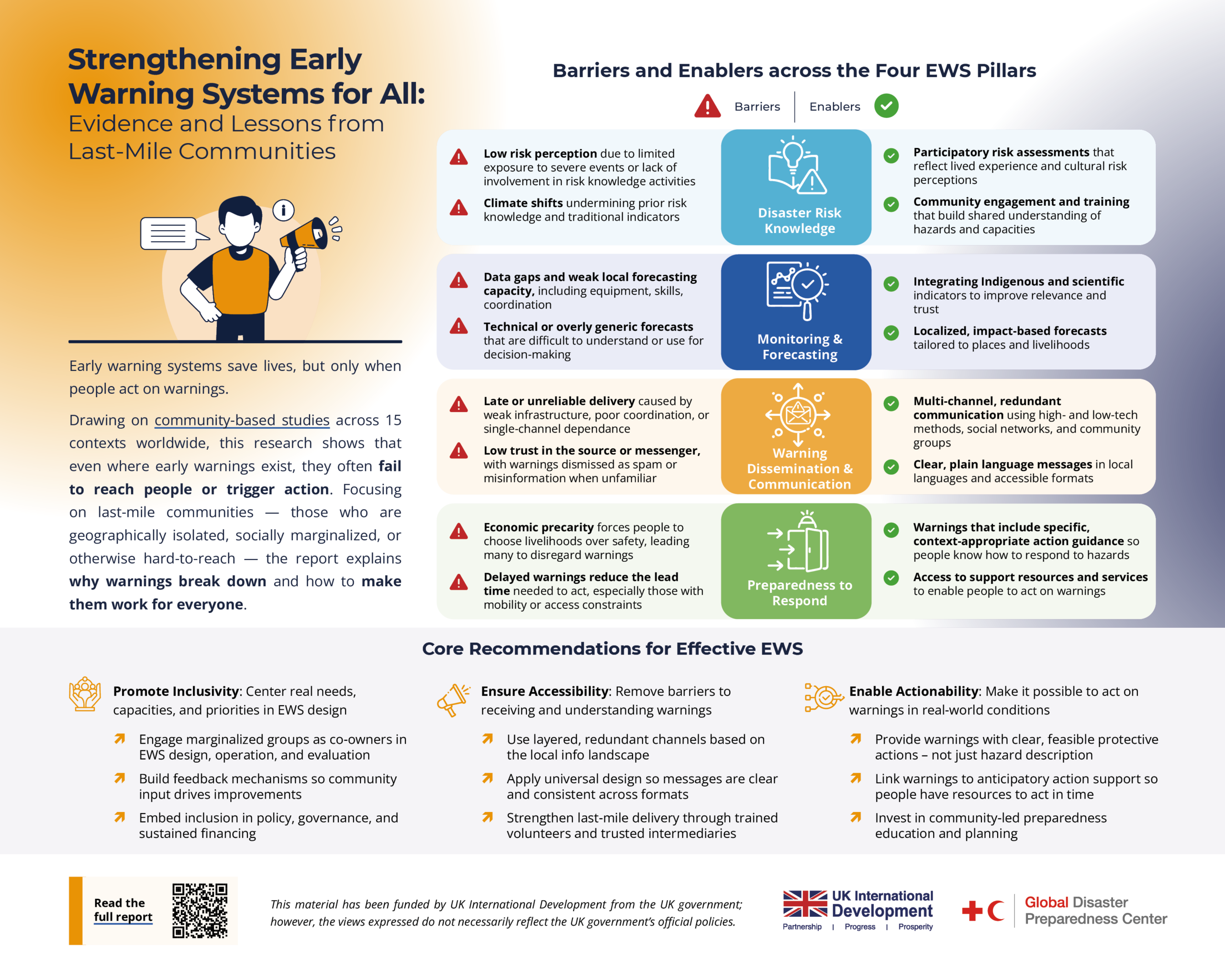 The analysis identifies recurring barriers and enabling practices across all four pillars of early warning systems — risk knowledge, hazard monitoring and forecasting, warning dissemination and communication, and preparedness to respond to warnings. It shows that inclusive engagement with communities, the integration of local and Indigenous knowledge, clear and accessible messaging, and adequate resourcing for early action are critical to ensuring warnings are received, understood, and acted upon. The findings underscore that no single communication channel reaches everyone and that people are most likely to respond to warnings delivered through trusted sources and redundant, context-appropriate channels.